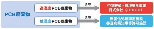 後圧変圧器・コンデンサー等の高濃度PCB廃棄物は中間貯蔵・環境安全事業株式会社(JESCO)で処理を行っています。低濃度PCB廃棄物については環境大臣が認定する無害化処理認定施設及び都道府県知事等が許可する施設で処理を行っています。